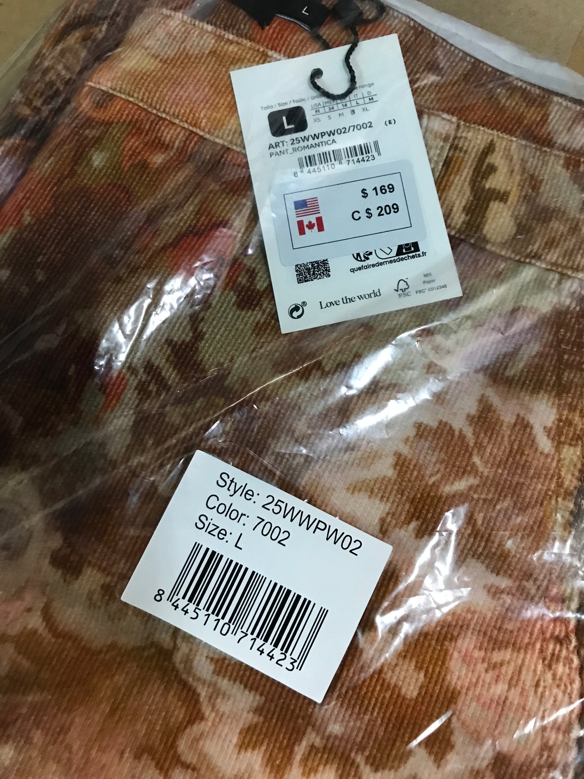 Fluid long pants in micro-corduroy, side and back pockets, and paisley print in orange tones.