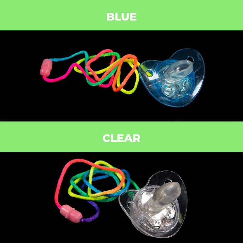 Our pacifiers are that fun attention-grabbing accessory you need! Not only do they make a great party favor, but with a soft tip, they are perfect for raves, concerts and parties. Our LED Pacifiers feature 3 bright LED lights within a clear casing, which strobe once activated for a cool effect.